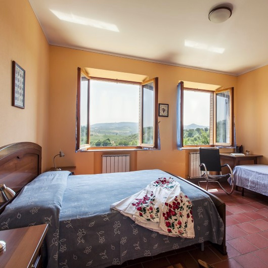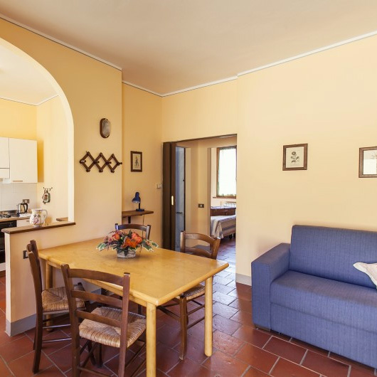 Spaziosi trilocali al piano terra con accesso diretto al giardino. Le camere affacciano sulla splendida campagna ed il Monte Cetona.